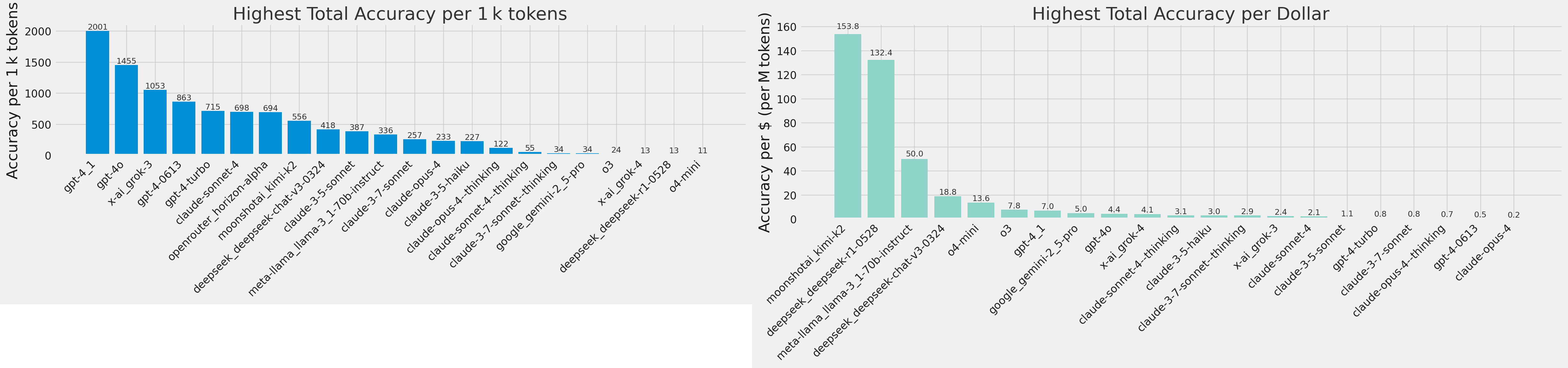 Reasoning models perform better, but non-reasoning models can still hold their own! This implies that reasoning helps, but the underlying model architecture and training data still matter. Reasoning models burn on average 50-100x more tokens for a 8-16 point improvement, so it might not be worth the tradeoff.