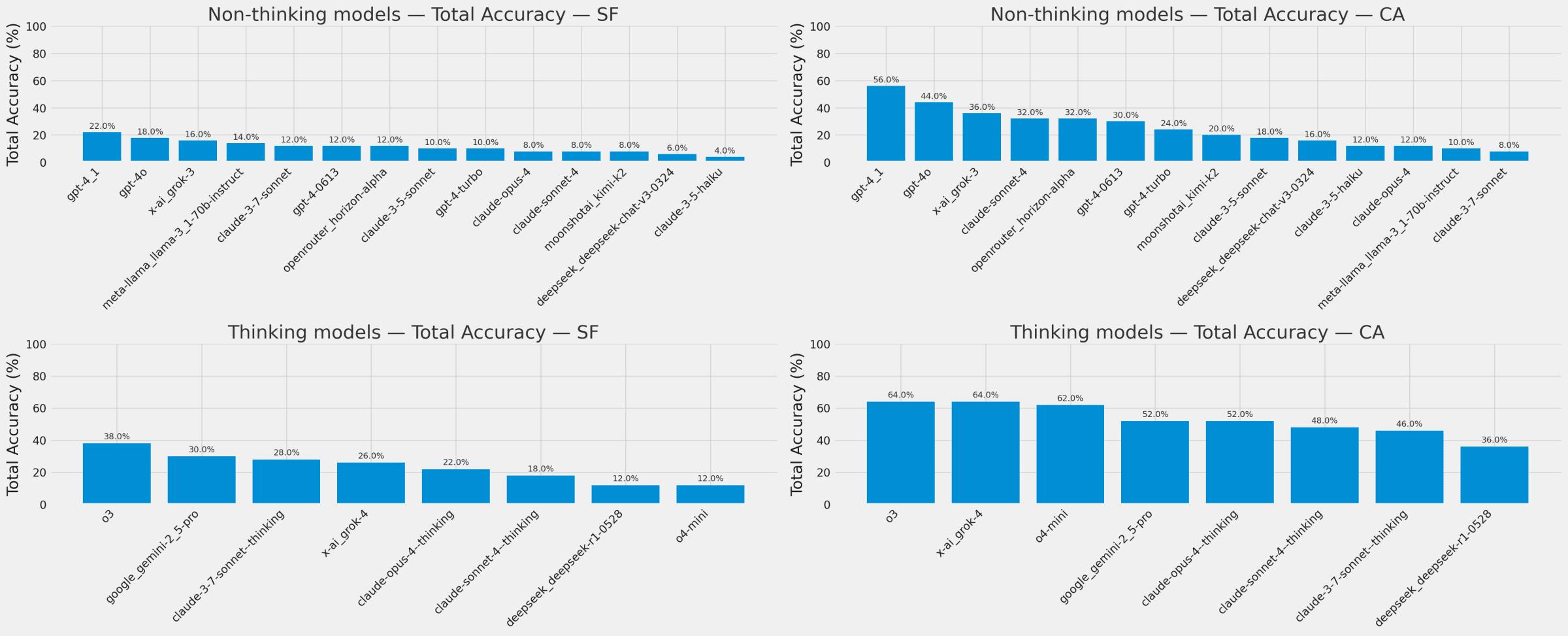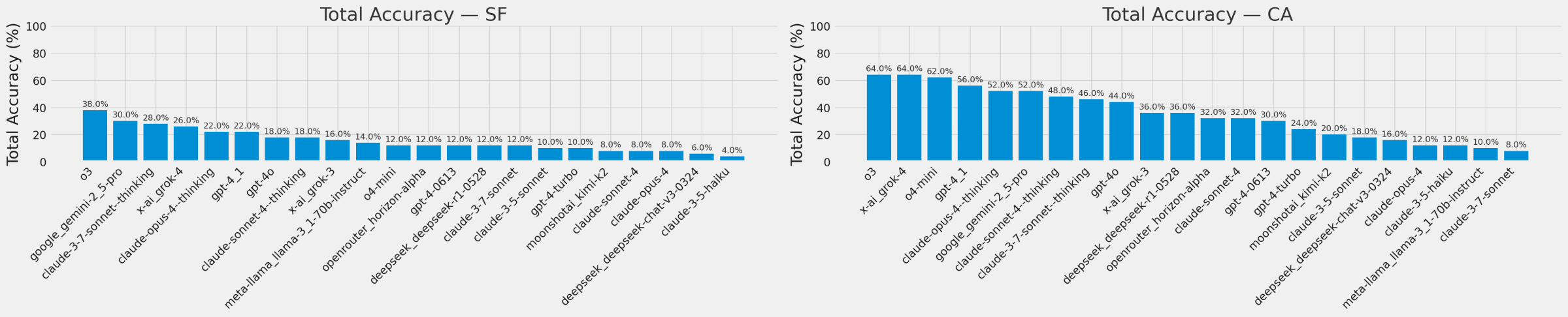 LLMs did not do well on the intra-city SF dataset, but did better by 26 percentage points on the inter-city CA highway dataset. o3 achieved the highest score on the SF dataset with 38% correct; o3, grok-4, and o4-mini won on the CA dataset with 62-64%.