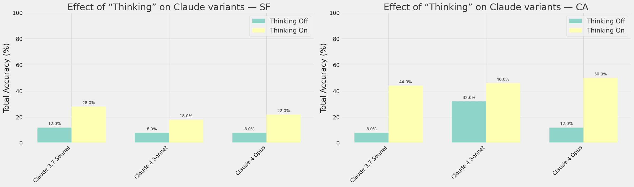 As a direct comparison, Claude models that can have reasoning switched on/off improve their accuracy by 10-38 percentage points with it on.