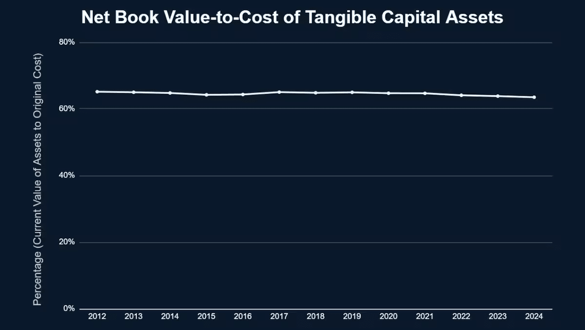The Finance Decoder shows Los Angeles holding steady on infrastructure maintenance, but at a dangerously high level of depletion. And that steadiness is misleading. New projects — like a $5.5 billion convention center expansion — add to the city’s Tangible Capital Assets in a way that hides decline. A lot of roads, pipes, and sidewalks can fall apart without appearing in the financial records if something shiny and expensive gets added to the balance sheet.