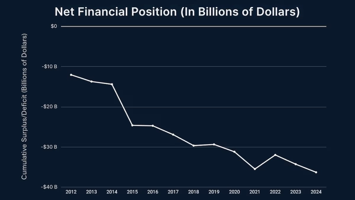 This might sound like alarmism, but the city’s own books tell the same story, just in a different language. When you look at Los Angeles through the Strong Towns Finance Decoder, the pattern is unmistakable. The city’s Net Financial Position — its total financial assets minus its total liabilities — is deeply negative. That figure represents past spending that must now be paid with future revenue. Before the city even begins to deal with today’s problems, it’s already carrying the weight of yesterday’s promises.