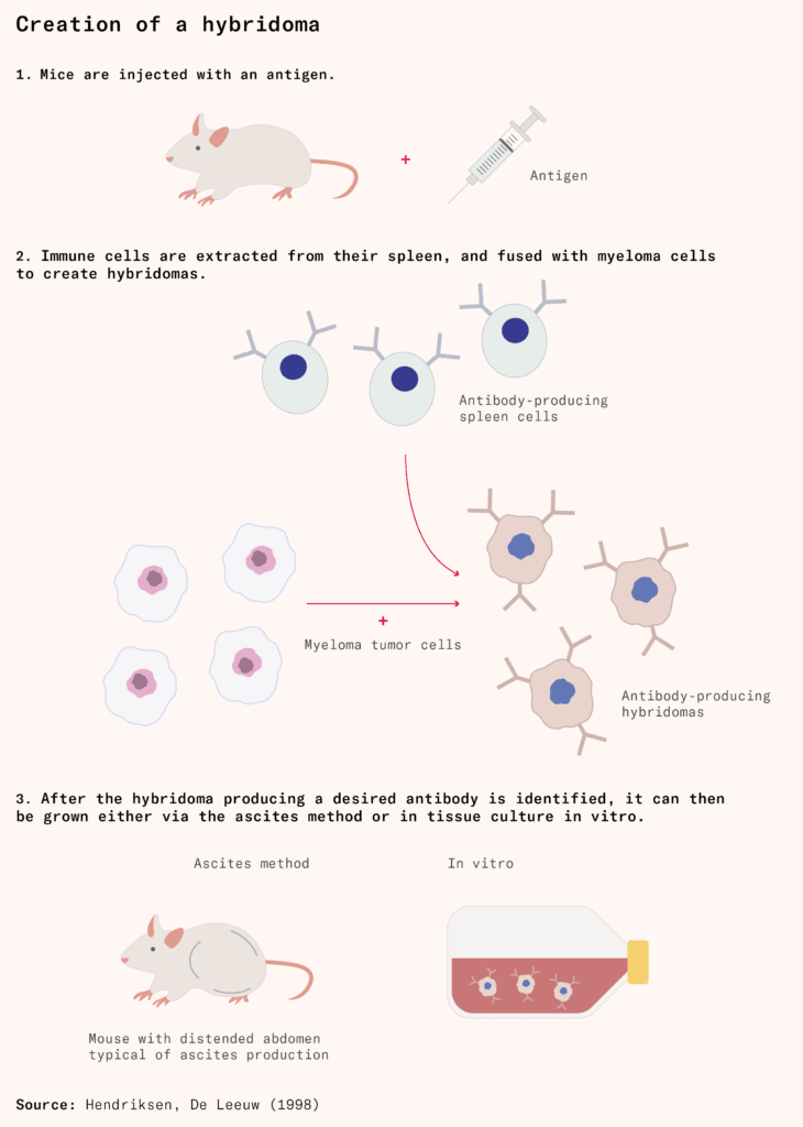 After growth, technicians or scientists repeatedly extracted fluid containing the antibody from the abdomen of the mice with a needle until it filled up again. The ascites method was cruel and painful for the mouse, which would eventually die of the induced tumor. But it was effective at producing highly concentrated monoclonal antibodies.