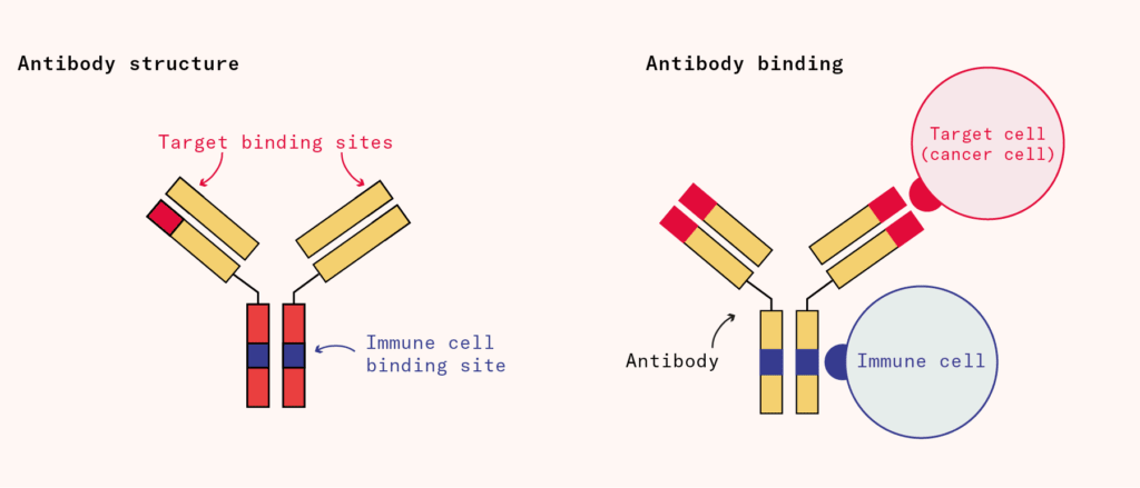 At the time of discovery and therapeutic application, Behring didn’t know which component in serum therapy was the active ‘disinfecting agent’. We now know that the antibodies were responsible. Antibodies are Y-shaped proteins tipped with exquisitely specific ‘lock and key’ targeting motifs that bind to foreign proteins in the blood or on the surface of cells. Antibodies neutralize the effects of their targets by binding and physically obstructing them, or by ‘tagging’ the target for removal by immune cells.