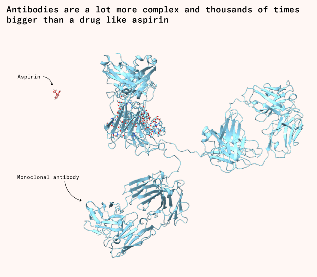 Even if the exact design for an antibody had been known, which it wasn’t, the sort of chemical synthesis we might do to produce a ‘small molecule’ drug like aspirin wasn’t feasible. As ‘biologics’, antibodies are thousands of times bigger than a drug like aspirin, and have much more complex structures. Even today, our chemical techniques lack the fine-grained control necessary to assemble all the pieces in the right order at scale. Entering the mid-20th century, the only viable path forward was to hijack existing cellular machinery and redirect it to our own ends.