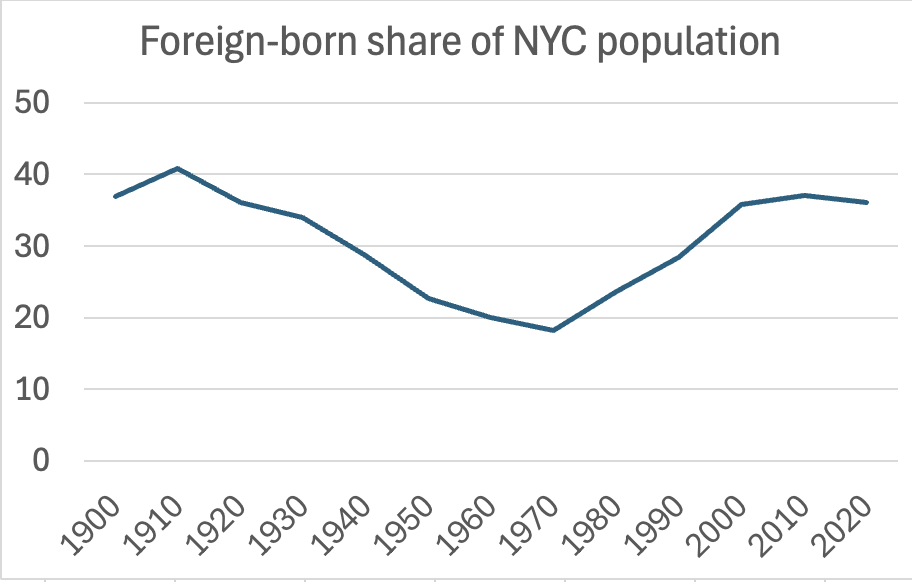 An aside: There was a period in the 1970s and 1980s when New York, in particular, actually was the kind of scary place people like Trump and Noem claim it still is. As it happens, that sort-of hellscape period coincided with an era when New York had fewer immigrants than at any time before or since:
