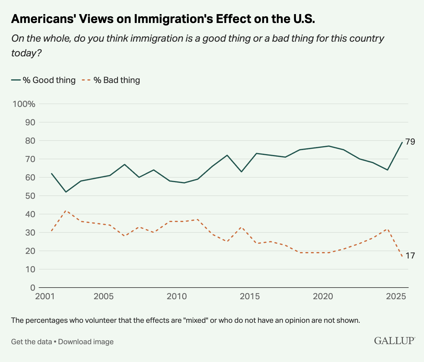 Gallup made a splash, at least among us wonks, with new polling on immigration showing that approval of immigration in general is now at a record high: