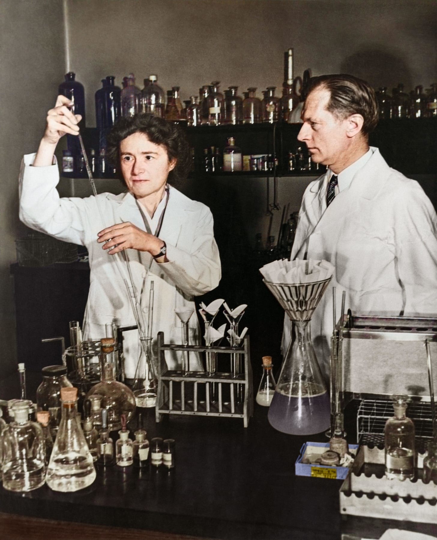 In both, glass bottles of reagents, racks of disposable plastic tips, and half-empty boxes of parafilm wrap cluttered the benches. pH meters dangled coils of cords next to old Gilson pipettes, resting on their sides. Ice buckets held a jumble of tubes, labels fading into illegibility. A tabletop centrifuge hummed in the corner, its brushed-metal body dented from hard use. Even the smell, if you could step inside the frame, would be familiar — likely a faint mix of ethanol and agar.