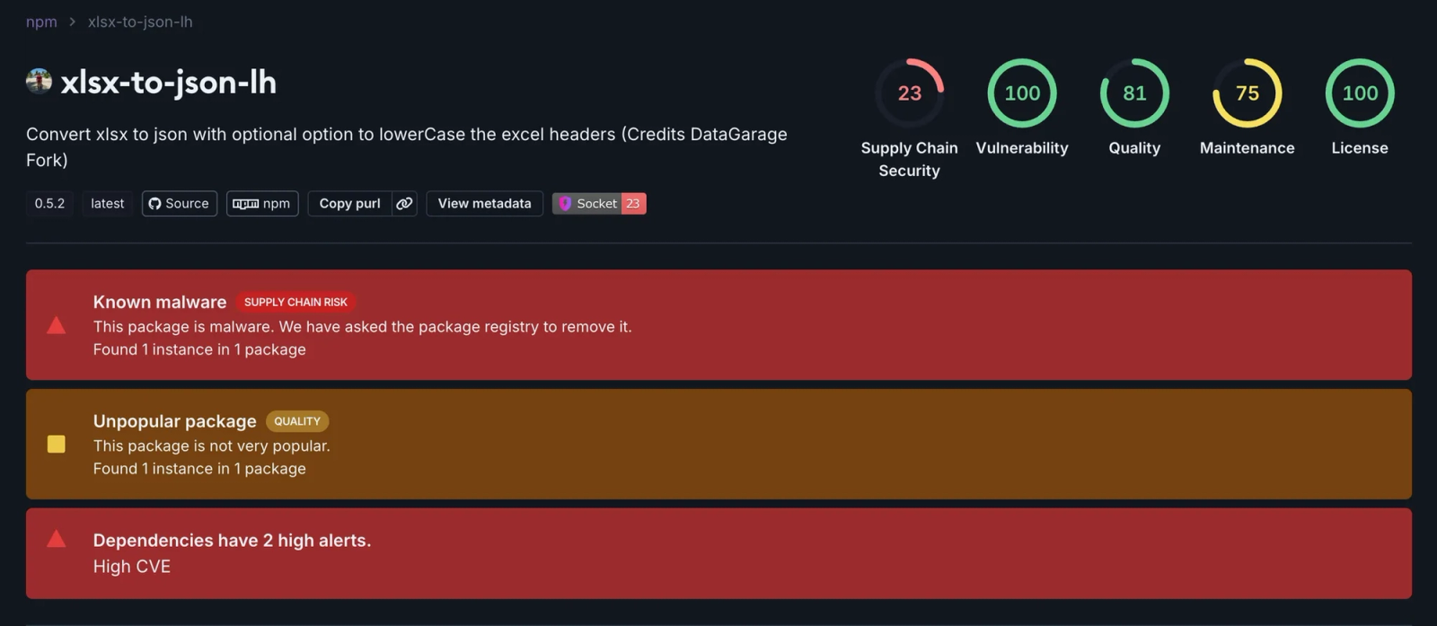 Socket's AI Scanner flagging the malicious package xlsx-to-json-lh as "Known malware"Exploiting Simple Typing Mistakes#