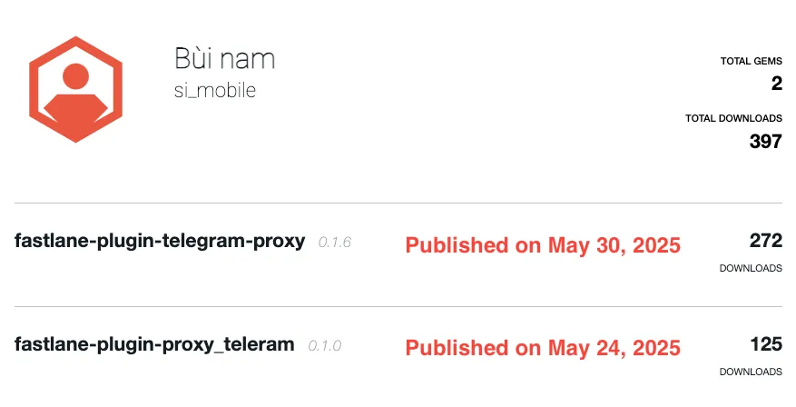 To strengthen the deception, the threat actor forked the official repository hosted at github.com/sergpetrov/fastlane-plugin-telegram and linked their fork (github[.]com/buidanhnam/fastlane‑plugin‑telegram) as the homepage for the malicious fastlane-plugin-telegram-proxy gem.