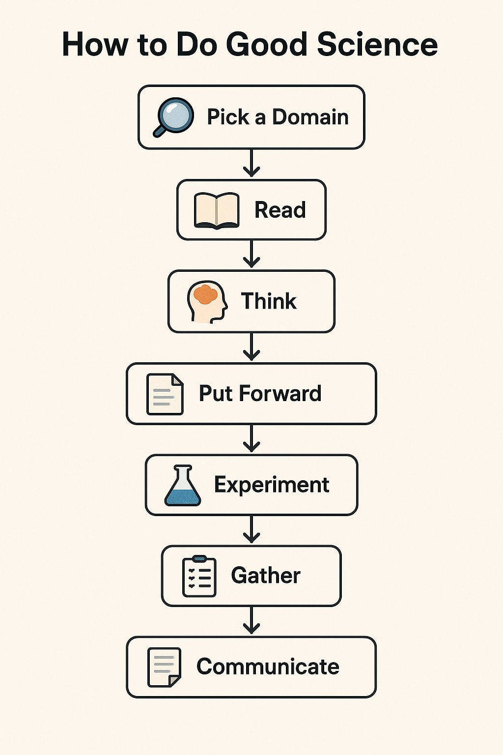 CHOOSE Pick a domain you're curious about | v READ Read everything until no new insights | v THINK Think about what everyone is missing | v HYPOTHESIZE Put forward precise claims | v EXPERIMENT Setup careful experiments | v VALIDATE Gather more evidence in various contexts | v COMMUNICATE Write a paperThat’s it! Hope you liked the manifesto.