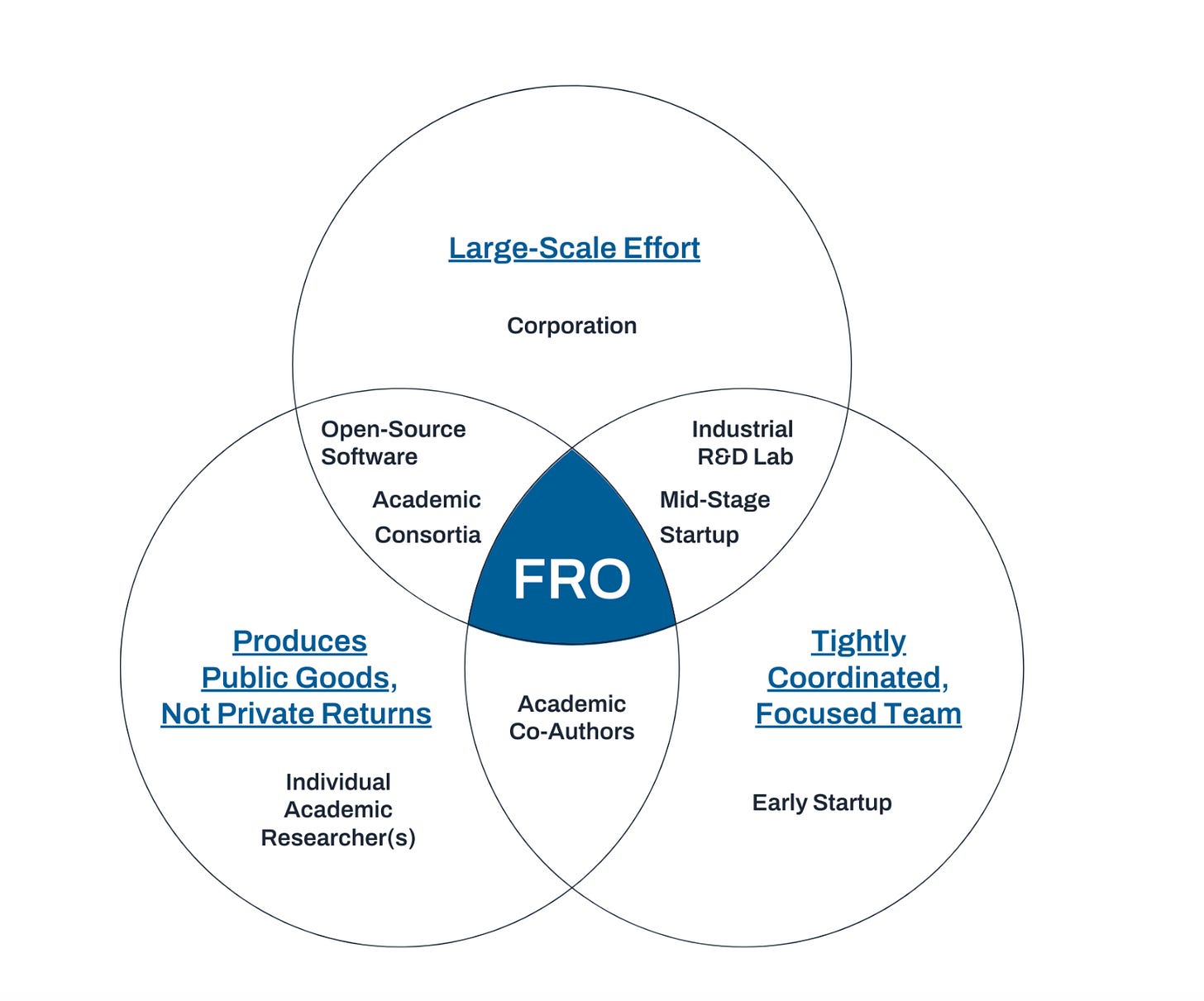 EvE is a bit unlike the typical startups I write about, because they aren’t really a startup. They are a FRO, or Focused Research Organization. Many reading this blog are likely already familiar with this recent renaissance of strange scientific organizations (something I’ve written about in the past) and already understand this acronym, but to those who don’t, this Venn diagram is quite instructive:
