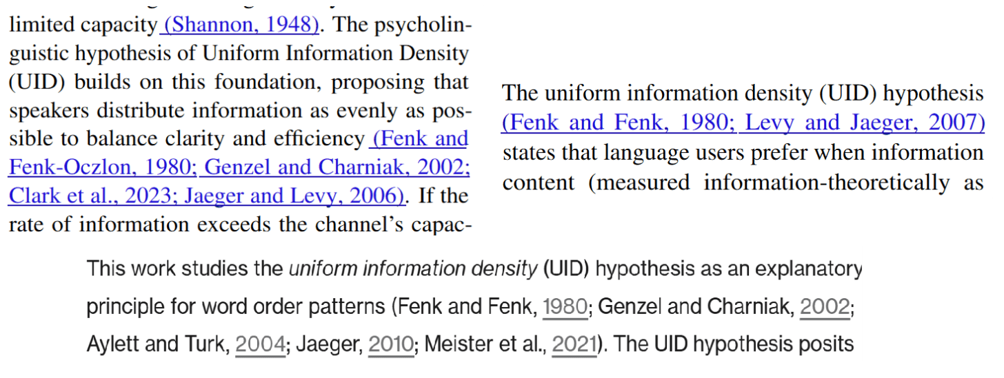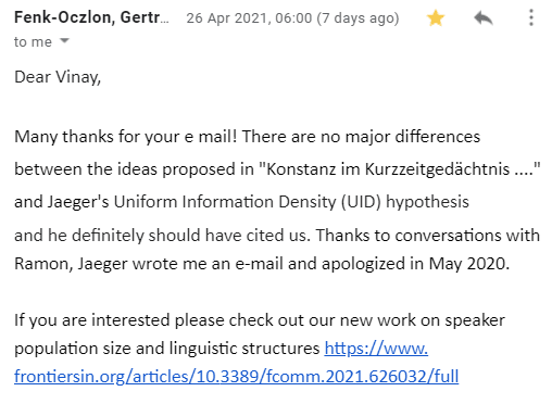 This hit me like a ton of bricks for a very specific reason. I had recently learnt of a sinister arrangement of “sub-authorship” targeting women in science (and especially computing) where their contributions were systematically relegated to the marginalia (typically the “acknowledgments section”) rather than being awarded co-authorship. This was textbook rank-and-file Matilda Effect in front of me which triggered the urge to reach out and learn more about this paper’s back story. I must mention that I was emboldened by my previous success in this regard. Back in 2021, I reached out to Prof. Gertraud Fenk-Oczlon about “Konstanz im Kurzzeitgedächtnis - Konstanz im sprachlichen Informationsfluß?” published in 1980 which introduced the “Uniform Information Density” hypothesis to NLP literature. As it turns out, she was never credited for this work and none of the NLP-adjacent courses I took as a PhD student at CMU mentioned her work.