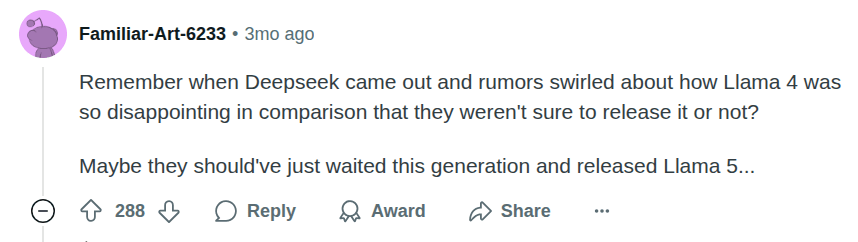 Supposedly, Llama 4 did perform well on benchmarks, but the user experience was so bad that people have accused Meta of cooking the books. Even though the company officially stands by Llama 4, rumor has it that Zuck is furious.