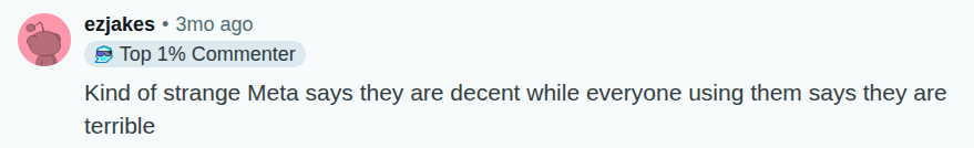 This kind of leadership is, unsurprisingly, not going to result in state of the art LLMs. Add in significant institutional inertia around the Metaverse and Reality Labs, and the general lack of focus that comes with being a large company, and you get to where Meta is today: behind.