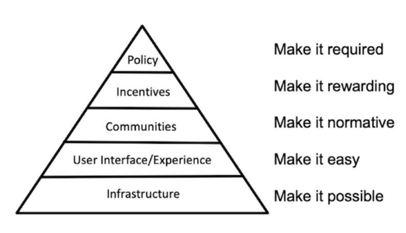 You can’t start at the top of the pyramid (“make it required”) if the other components aren’t there first. For one thing, no one is going to vote for a journal or funder policy to mandate data sharing if it isn’t even possible. Getting buy-in for such a policy would require work to make data sharing not just possible, but more normative and rewarding within a field.