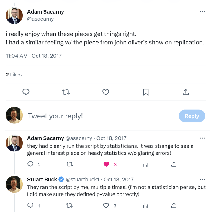 My experience consulting with the John Oliver show is hard to categorize, as it was thoroughly serendipitous and not part of a broader communications strategy. Indeed, I doubt I’d have been able to get scientific reproducibility on the John Oliver show if I had tried!