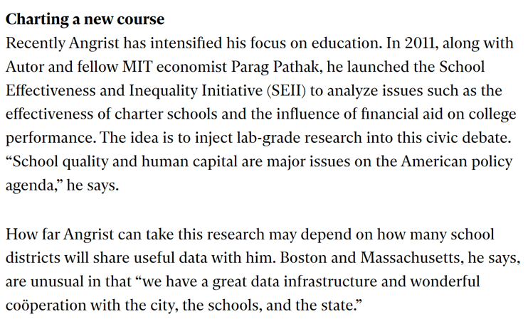 Second, I saw a Jan. 2, 2013 article about an MIT economist named Joshua Angrist and his then-recent interest in education research.
