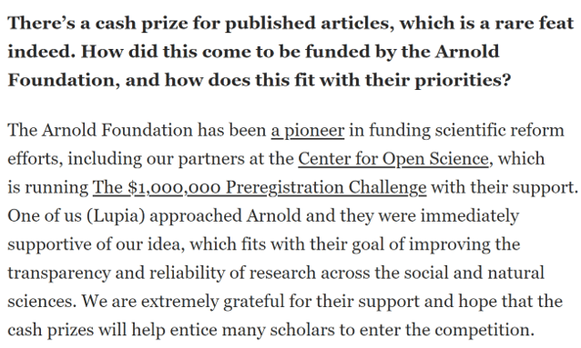 The episode came out in May 2016, and is available here. Among the Arnold grantees featured were Brian Nosek and Elizabeth Iorns (whose video I provided to the show). It was gratifying when, in 2017, a Columbia professor tweeted this:
