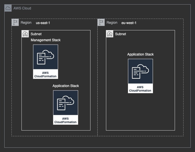 This design implements a “Root” stack that then deploys the subsequent region-specific stacks. The root stack will be deployed into the default region associated with the profile (us-east-1 unless specified). There are several things achieved with this.