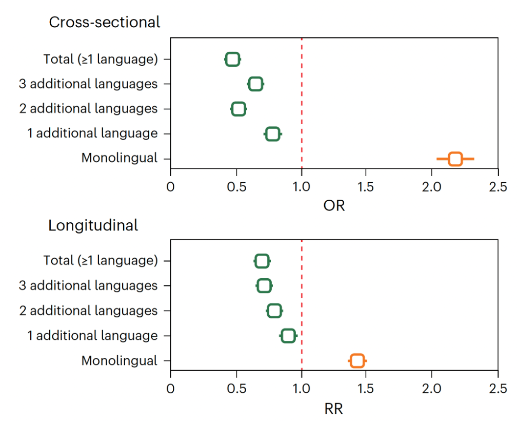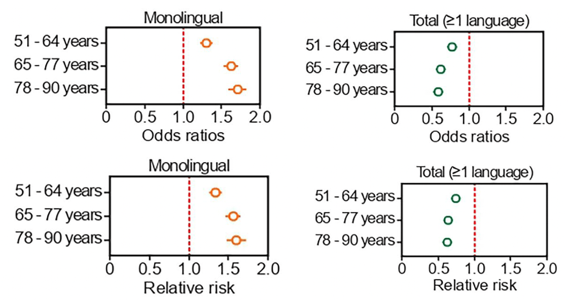 There were 3 major analyses, one by cross-section (aggregate data for multi vs mono-lingual), longitudinal data that factor in time of follow-up, and a subgroup analysis by age. In the cross-sectional analysis, monolinguals were 2.1 fold more likely to develop accelerated aging whereas those speaking one or more languages were 2.2 time less likely (odds ratio of 0.46) to experience accelerated aging. For the longitudinal analysis, the risk ratio for monolinguals was 1.4 fold for accelerated aging, and 1.4 fold less for multilingual. You can see the dose response with increased additional languages and more protection, i.e. less likely for developing accelerated aging. Correspondingly, the age subgroups for the cross-sectional (top) and longitudinal (bottom) of the graph at bottom below shows the risk or protection to be present across all ages, increasing risk of accelerated aging in monolinguals with increasing age. In contrast, the multilinguals with 2 or more additional languages had more protection within older age groups (data not shown below, in Extended Figure 1 of paper).