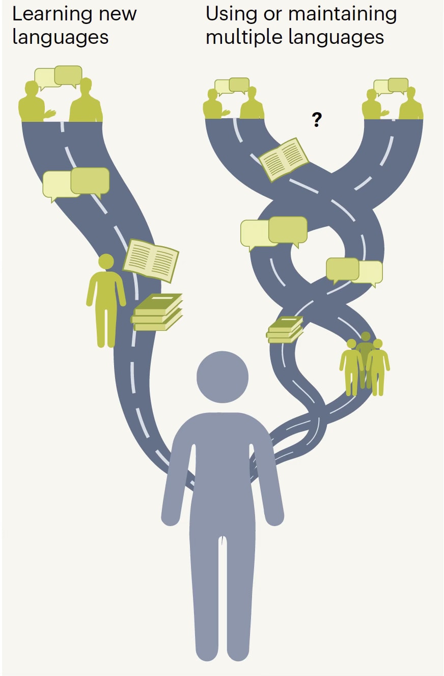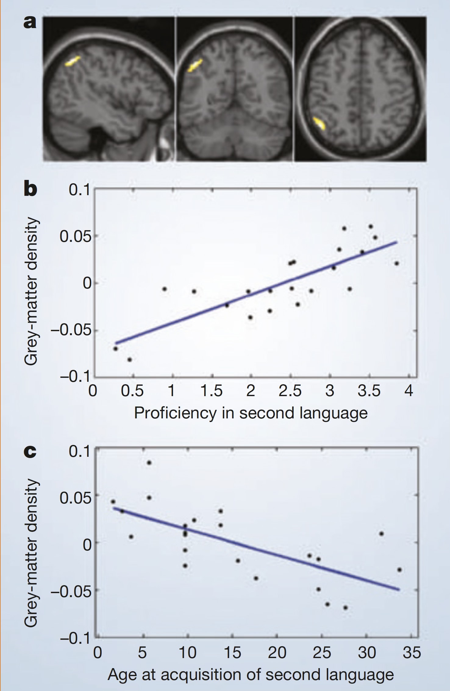Over the past two decades there have been many reports that multilingual individuals have improved cognition compared with their monolingual counterparts with better attention, task switching, working memory and potential protection from Alzheimer’s disease. It’s not just advantages for functionality. Brain structure studies in multilingual vs monolingual participants have shown increased gray matter density in key regions (caudate nucleus, left inferior parietal cortex) that are linked to executive function, such as this frequently cited 2004 paper (Figure below). This feature is known as neuroplasticity—the brain’s ability to change and reorganize its neural connections throughout life. Note how the gray matter density increase is maximum when proficiency in a second language occurs as a younger age.