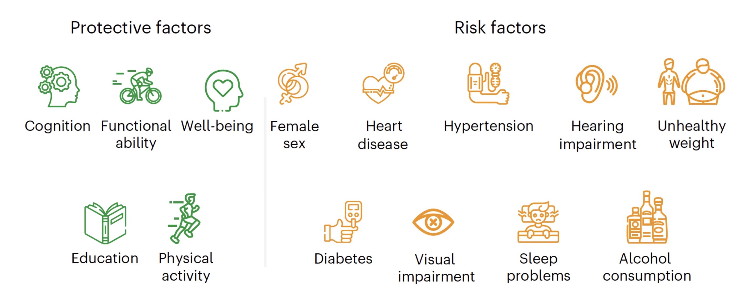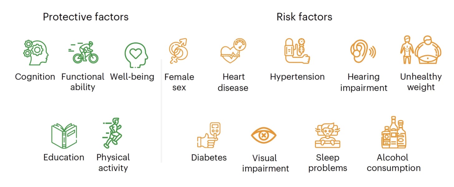 Agustin Ibañez, from the Global Brain Health Institute and Scientific Director of the Latin American Brain Health Institute, along with colleagues throughout Europe, published a study of over 86,000 adults from age 51 to 90, mean age 66.6, from 27 countries in Europe. They developed a biobehavioral age gap (BAG), like body-wide or organ clocks, that are a metric of the pace of aging of an individual or organ, from all the known risk and protective factors, some of which are shown below. Multi- or mono-lingualism was derived from country level data. Individuals underwent repeat national surveys for all the known protective and risk factors on a longitudinal basis. The survey questions are published in the Supplementary data.