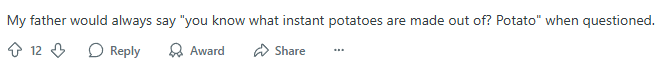 The other factors contributed to the unique awfulness of my father’s instant mashed potatoes, though.