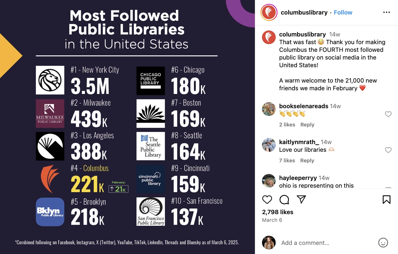 RK: You'll often share graphics that show where Columbus Library sits in terms of following of libraries. Why is building an engaged community online an important metric for a library?