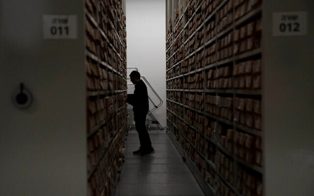 A worker peruses the documents archive at The Moshal Shoah Legacy Campus and The David and Fela Shapell Family Collections Center, at Yad Vashem in Jerusalem, July 8, 2024. (AP Photo/Maya Alleruzzo)