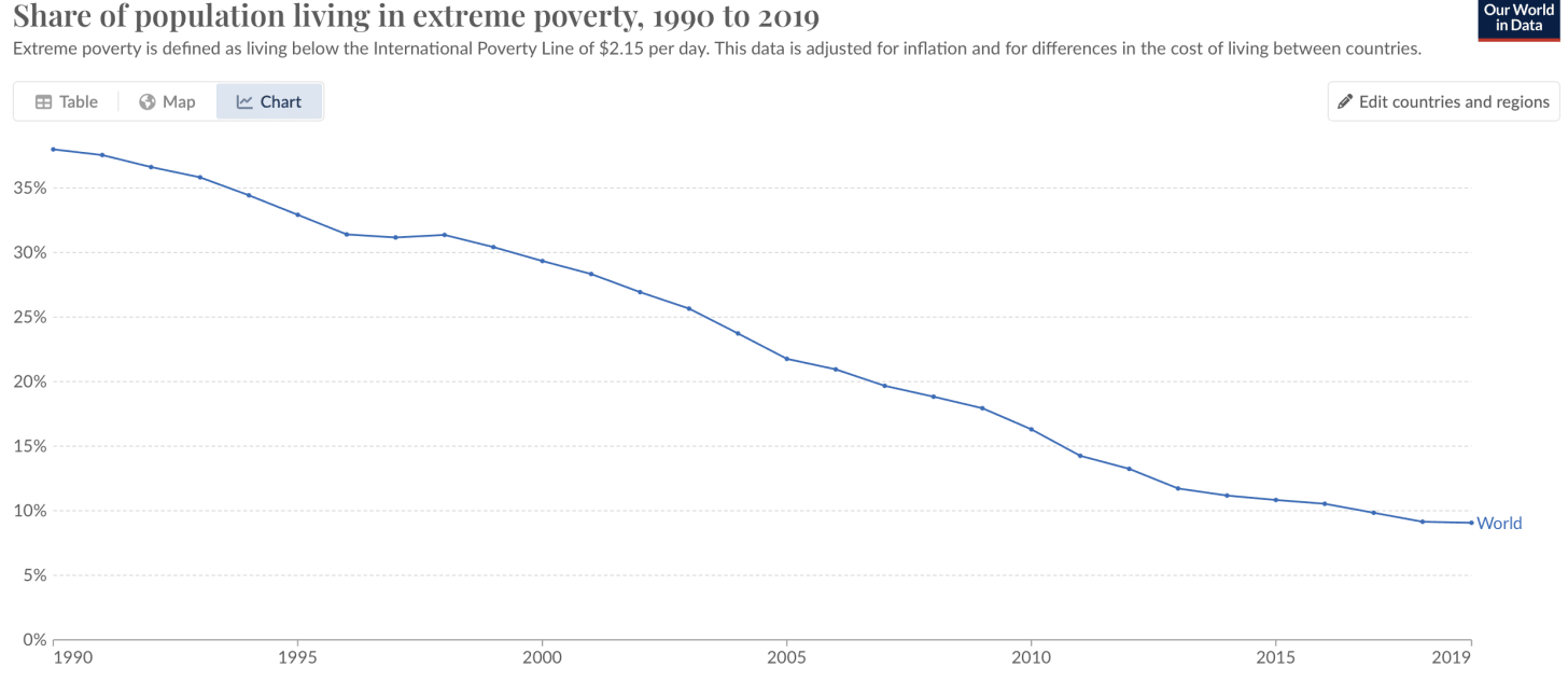 The share of the world’s population that lives in extreme global poverty has fallen dramatically since I graduated from college. That’s happened even as global population has increased substantially, so the number of non-poor people has just absolutely surged.