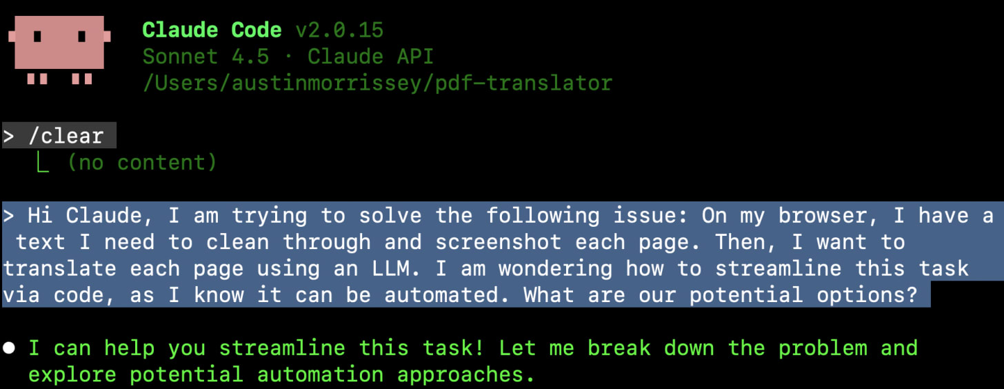 Instead, we’ll use the Python library PyPDF2 to extract the text. Given the same PDF, it’ll produce identical output. Having this intermediate step makes our life easier later on, when we seek to verify translation accuracy. Following the extraction, we’ll have a script divide the corpus into manageable, bite-sized chunks for the LLM. The principle here, again, is to not ask too much at once. If you follow this advice, you avoid much disappointment when working with AI. An LLM will not tell you no. If you provide it the full book and ask for a translation, it will give you one, and it will be bad. Exercise judgment.