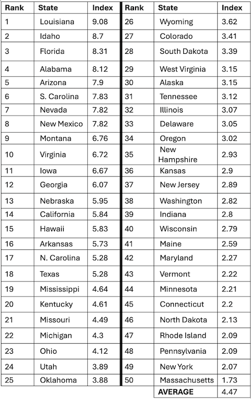 Diana Thomas and Devon Gorry showed that an increase in group sizes and educational requirements could have significant effects on child care prices. Using the Child Care Regulation Index, we can see that a one-point increase in the index score, which represents more child care freedom, predicts a decrease of $774 per year in infant center-based child care costs, according to 2023 data. This is nearly a 5% reduction in prices per index point. The differences between Louisiana and Massachusetts in terms of child care freedom result in a price difference of over $5,600 annually for infant care.