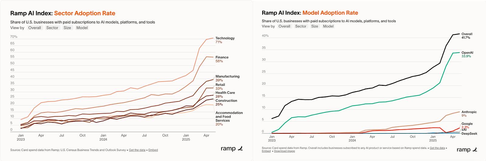 These reports are fascinating artifacts of standalone research. In the AI Index, we learn that OpenAI dominates other model providers like Anthropic, xAI, Google, and DeepSeek in terms of firm-wide adoption (a little more than 41% of businesses that use Ramp’s corporate cards also pay for AI, led by OpenAI at 33.9%). Notably, for the first time there was a flatlining of AI adoption in May; despite this slowdown, the US government is likely dramatically underestimating AI model adoption, as evidenced by the fact that they report only 9% of firms spend on AI model subscriptions. Either that, or Ramp’s customers are just way more tech-native than the average business, which in itself is a significant finding.
