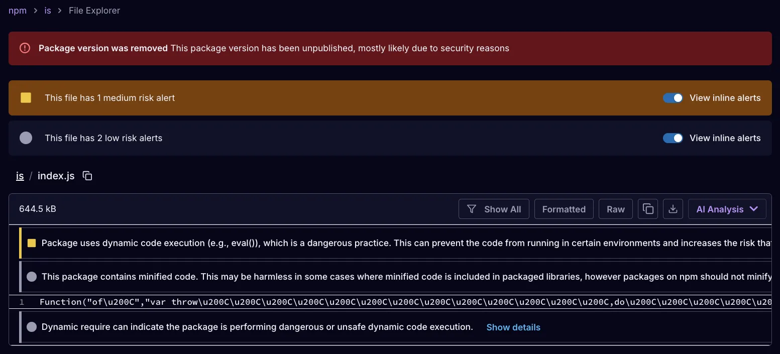 Socket AI Scanner identifies a heavily‑obfuscated JavaScript loader embedded in the is package version 5.0.0.