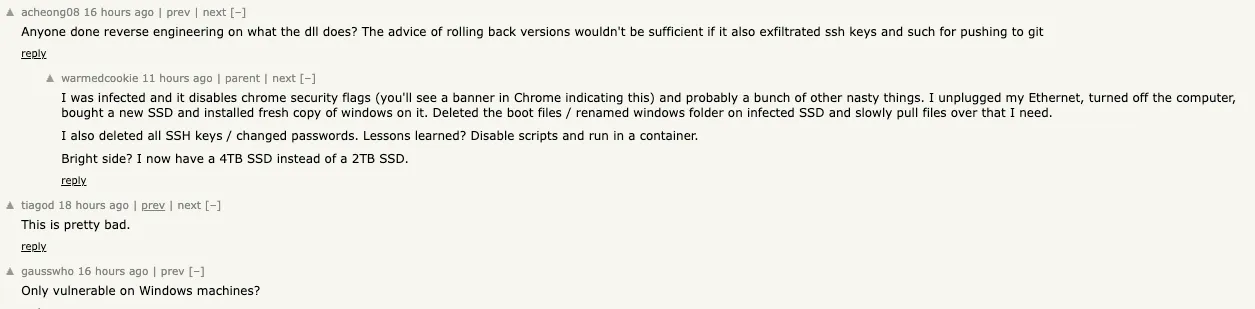 The Scavenger malware is proving to be especially nasty for anyone who got hit. In a Hacker News thread, one developer shared how they discovered the malware disabled Chrome’s security flags (causing a warning banner in Chrome) and likely performed other malicious actions. To recover, they had to unplug their machine from the network, replace their SSD entirely, reinstall a fresh copy of Windows, and rotate all SSH keys and passwords.