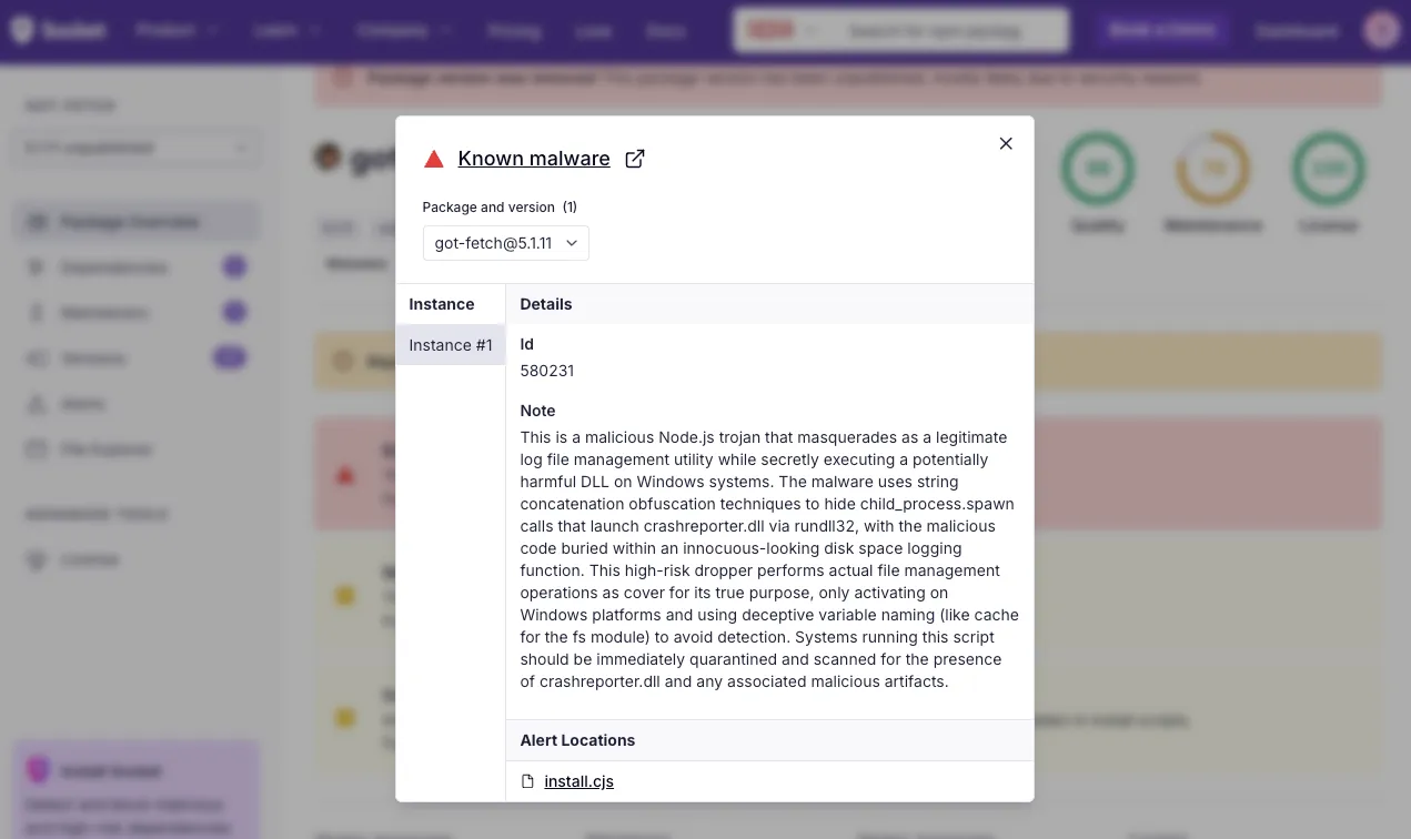 Socket’s automated threat detection also flagged malicious releases of got-fetch, a package with 20K+ weekly downloads, after an npm maintainer’s account was compromised. Both version 5.1.12 and version 5.1.11 were identified as containing suspicious behavior.