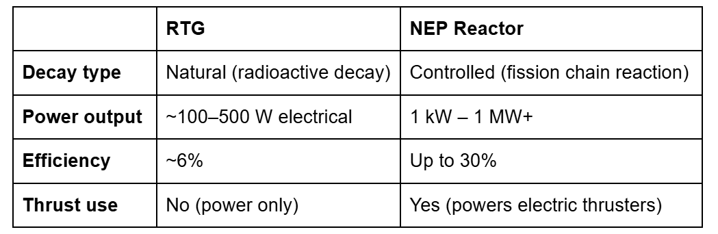 Can RTGs power NEP? In theory, yes. In practice, no, they don’t produce enough power. NEP needs tens to hundreds of kilowatts to operate meaningful thrusters. RTGs work well for long-lived, low-power systems like science probes but are incompatible with propulsion.