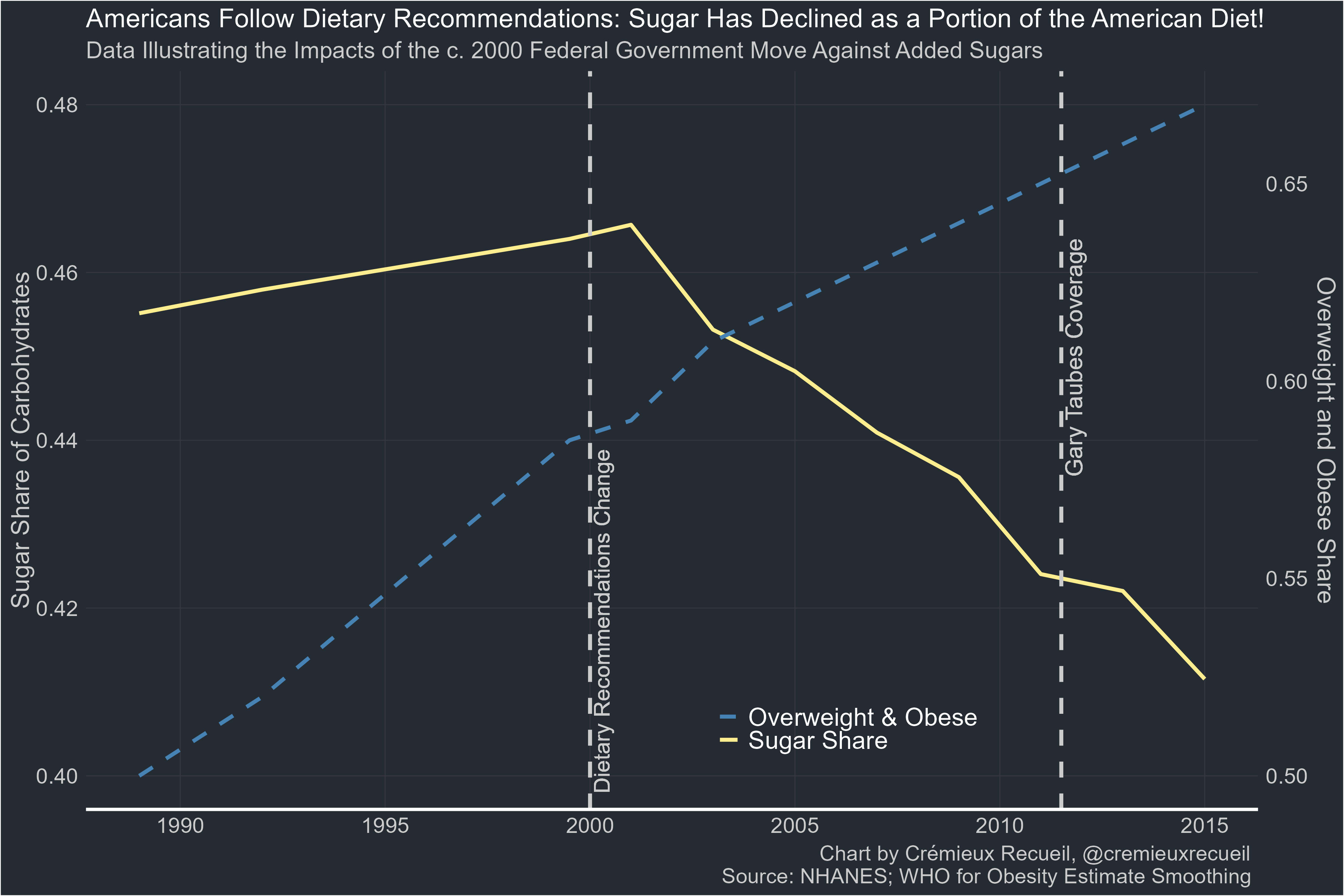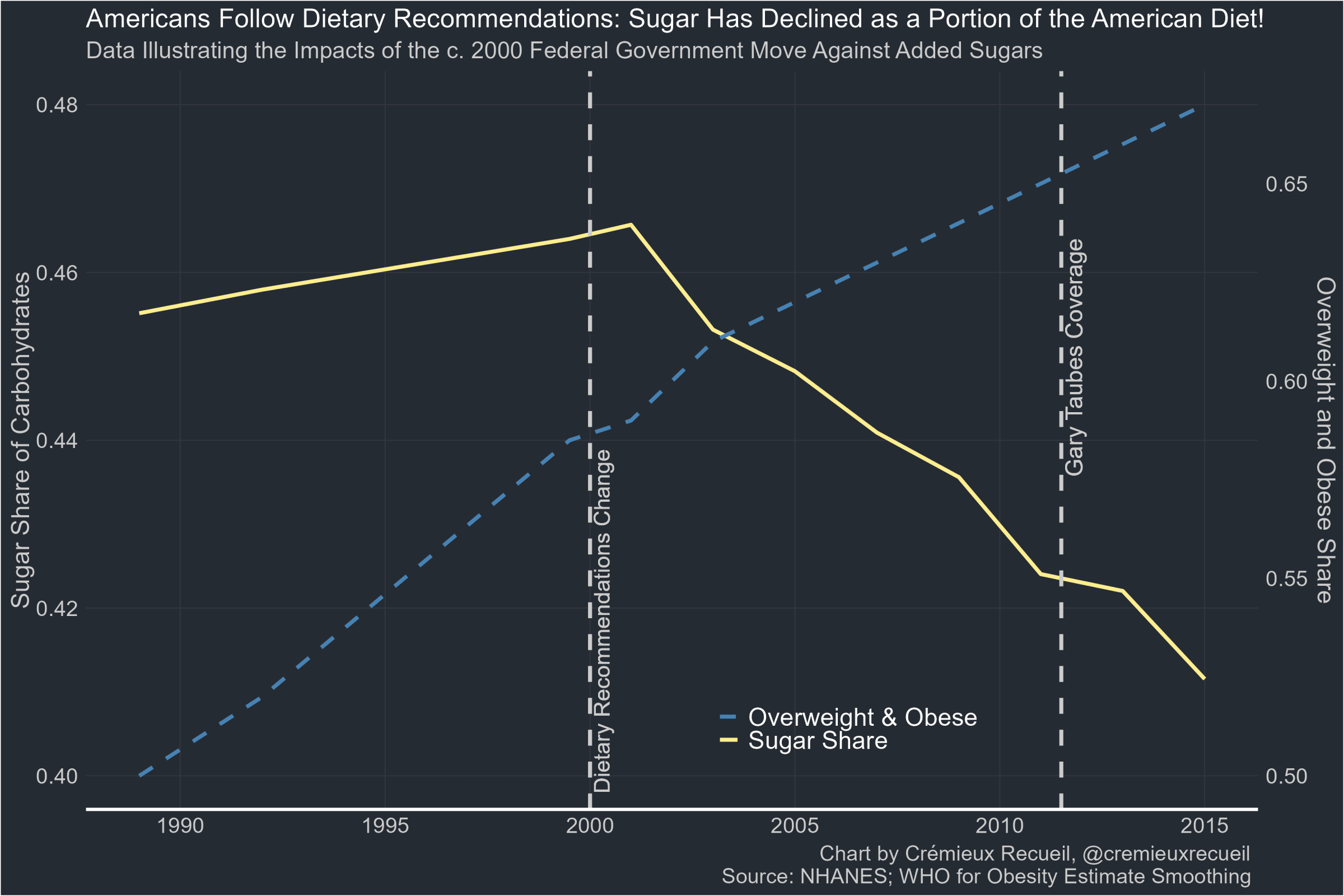 The harms of sugar have been the received wisdom ever since 2000, when U.S. dietary guidelines were updated to include explicit to encourage avoidance of foods with added sugars. After that guidance went out, people reduced the sugar share of dietary carbohydrates, but obesity didn’t seem to respond. If sugar is so critical, how do we explain that?