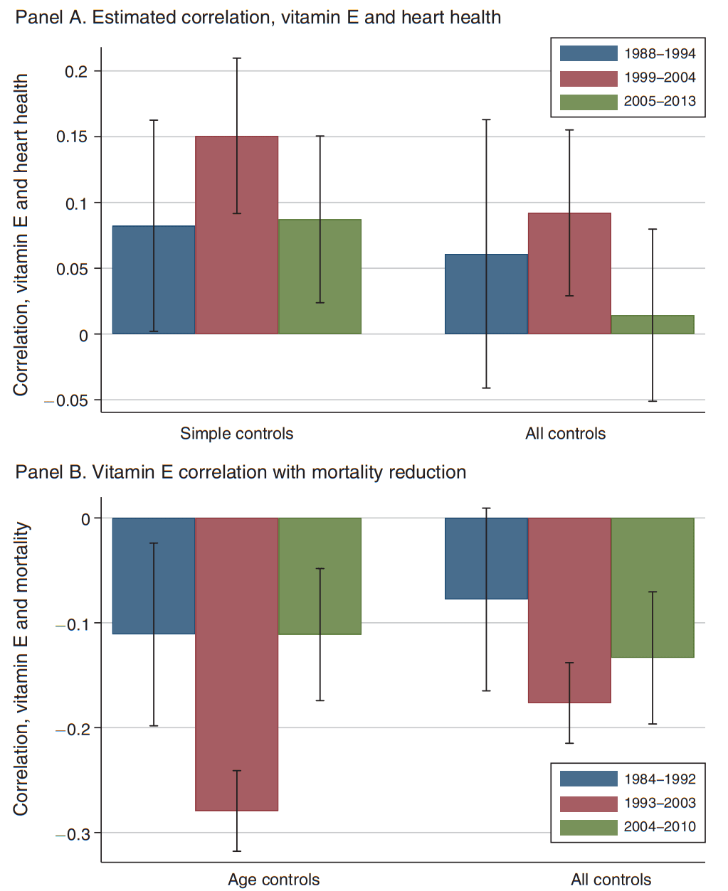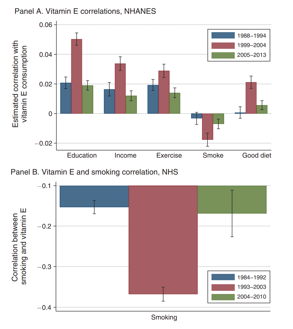 During the time in which vitamin E supplementation was held in high regard, we see the same pattern we did with sugar: its use became confounded with class markers. Healthier people started supplementing vitamin E, but before and after the ‘healthful period’, the correlations dropped.
