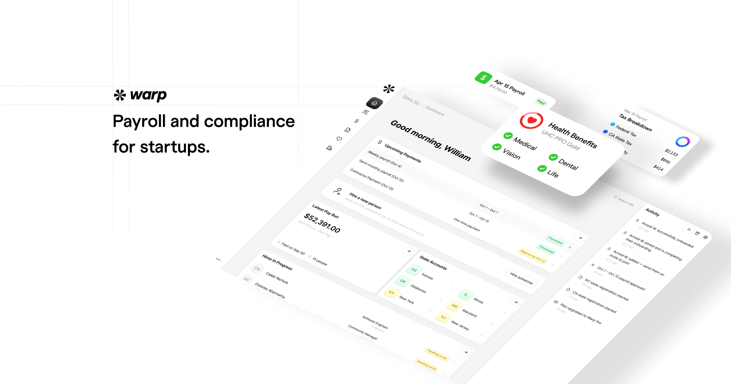 Warp has cut out all the features you don’t need (looking at you, Gusto’s “e-Welcome” card for new employees) and has automated the ones you do: federal, state, and local tax compliance, global contractor payments, and 5-minute onboarding.