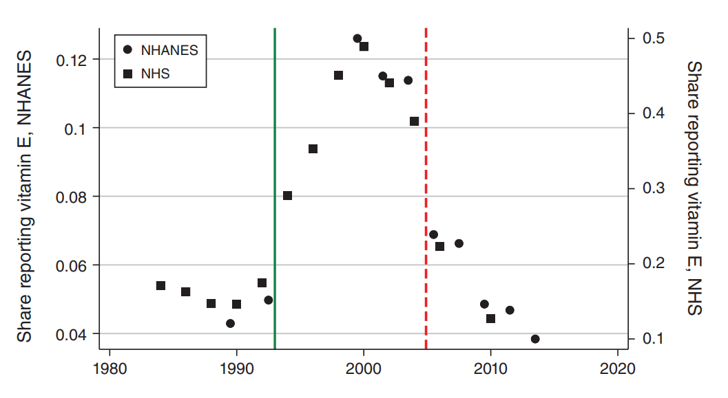 A reversed example might make the issue of selection clearer. Consider the case of vitamin E supplementation. In 1993, two studies in the New England Journal of Medicine reported that supplementing with vitamin E could reduce the risk of heart disease. In 2004, a popular meta-analysis found that high doses of vitamin E were associated with increased rather than decreased mortality. In the NHANES and the Nurses’ Health Study (NHS), people reported a massive uptick in vitamin E supplementation after its’ alleged health benefits became known, and they reported a reduction after its’ alleged harms were better appreciated.