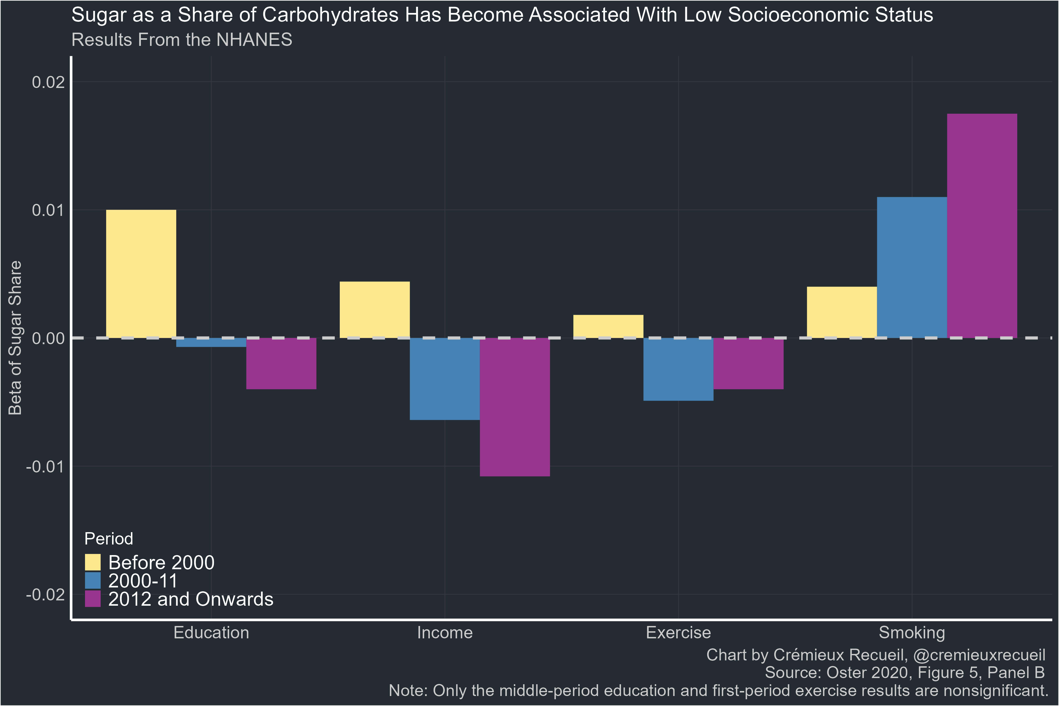 People who obtained a higher share of their carbohydrates from sugar used to be more educated, higher-income, no less liable to exercise, and only slightly disposed towards smoking more. But after the news got out that sugar was not recommended, the associations drifted. In the period after Gary Taubes graced 60 Minutes and mainstream newspapers galore with the news of sugar’s harms, the associations kept becoming even more severe.