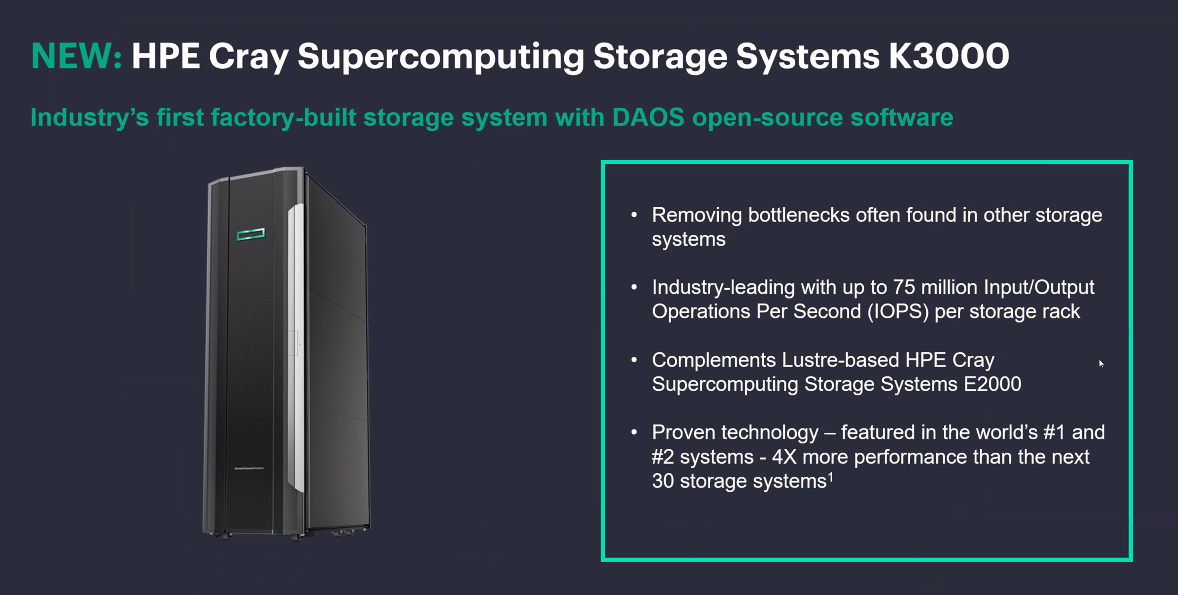 Augmenting the GX5000 will be the Cray Supercomputing Storage System K3000, which comes with embedded DAOS software. Intel late last year transferred its DAOS development team to HPE. DAOS software is also part of the Aurora system, and with the all-flash K3000, HPE has a factory-built storage system with DAOS embedded that will deliver as much as 75 million IO operations per second (IOPS) per storage rack, 39 percent higher than other systems, according to Damkroger.