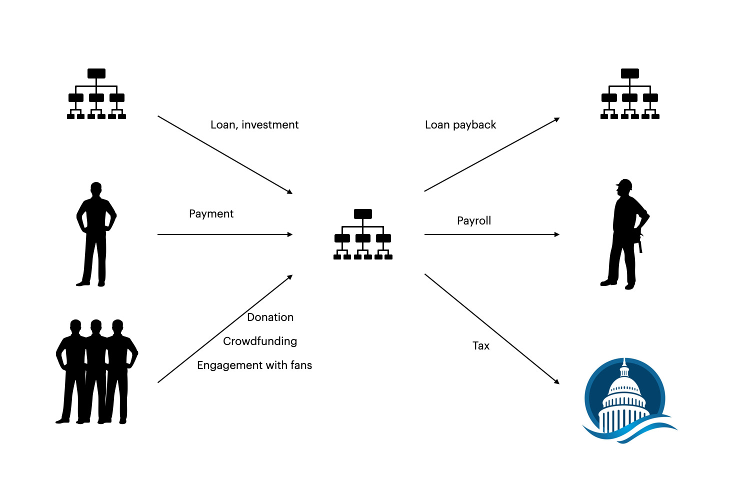 Like, imagine the organization in the middle is a simple restaurant, it asks for a loan from a bank, an org, and pays back to loan to the bank too. It gets payment from customers through a couple of softwares with a couple of intermediaries. Namely, visa, mastercard, POS provider, and the bank. Each one is charging some fees either by taking a share from the purchase or by blocking the money for some time.