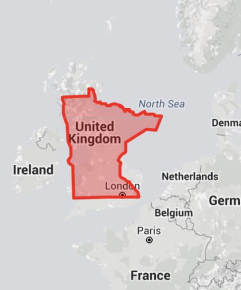 America’s natural beauty lives up to the hype. It’s extraordinary. And driving through it all on enormous, empty highways with the windows rolled down is one of the great joys of American life. To be fair, America is really big. Here’s my home state (Minnesota) superimposed over the UK: