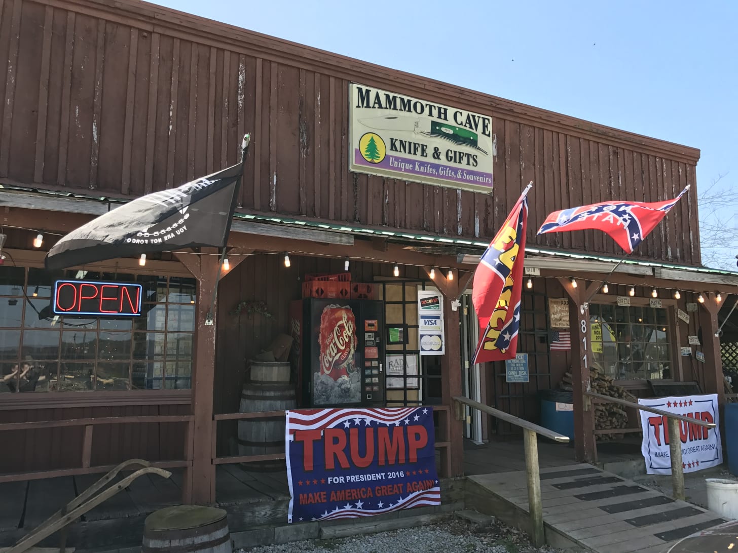 We started the morning by visiting a shop near Mammoth Cave that had a series of TRUMP banners alongside a disturbing array of Confederate flags flapping in the wind. I noted that the sign advertised that the shop sold “unique knifes” [sic]. (In chatting to the owner, I somehow failed to mention my recent appearance on MSNBC).