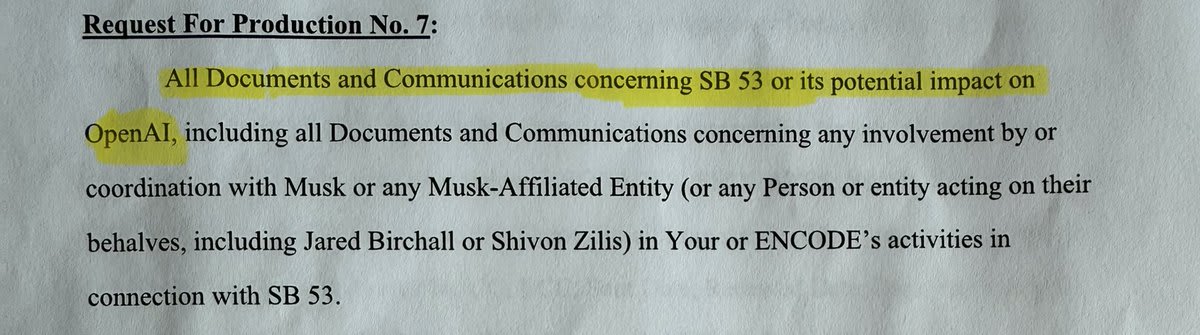 Some have pointed out that the subpoena to Encode requests “all” documents related to SB53, implying that the focus wasn’t Elon. As others have mentioned in the replies, this is standard language as each side’s counsel negotiates and works through to narrow what will get produced, objects, refuses, etc. Focusing on one word ignores the other hundreds that make it clear what the object of concern was.