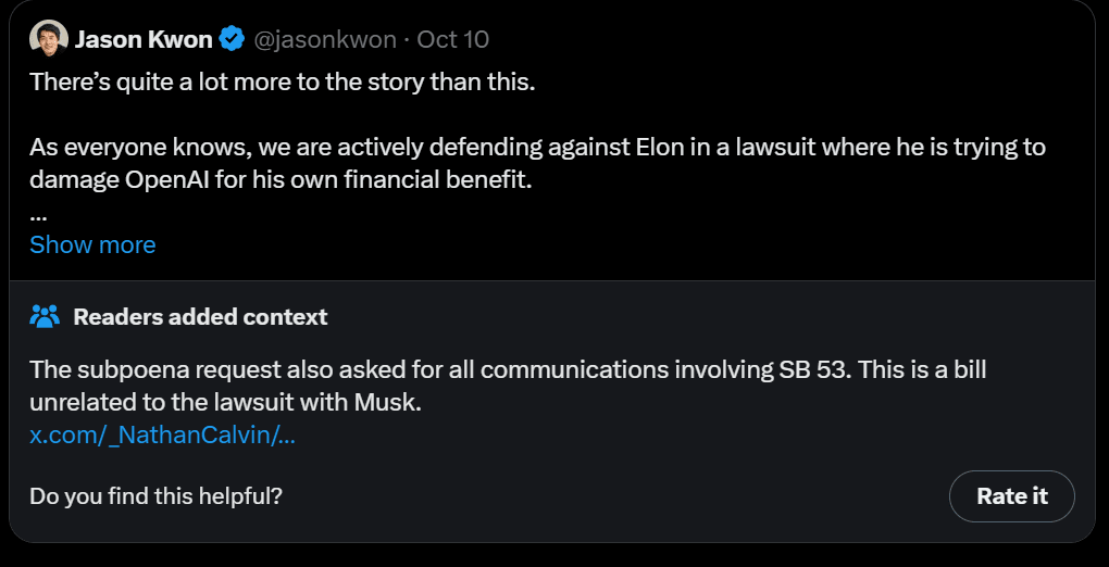 Subpoenas are part of how both sides seek information and gather facts for transparency; they don’t assign fault or carry penalties. Our goal was to understand the full context of why Encode chose to join Elon’s legal challenge.