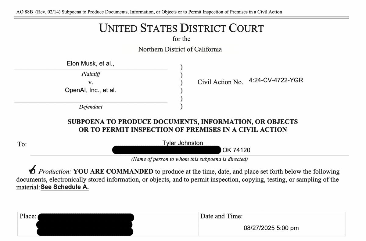 Musk is different, as OAI has filed counterclaims alleging Musk is harassing them. So OAI DOES have a legal right to info from third-parties relevant to Musk’s purported harassment, PROVIDED the requests are narrowly tailored and well-founded.