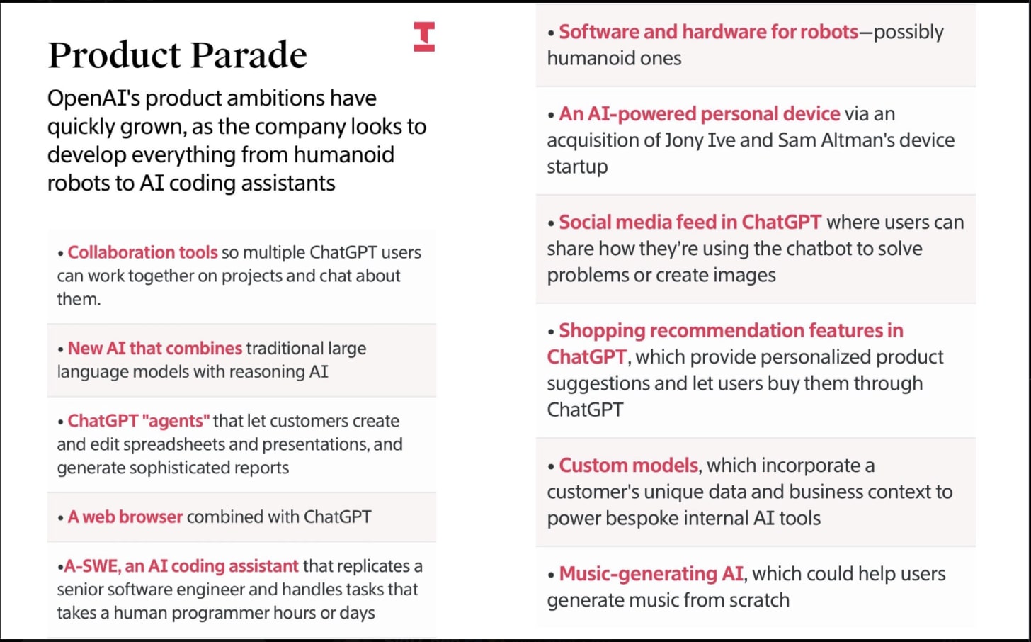 And an agent builder. And advertising. And an enterprise ChatGPT. And a personal device. And a social media product (Sora). And a web browser. And a music generation app.